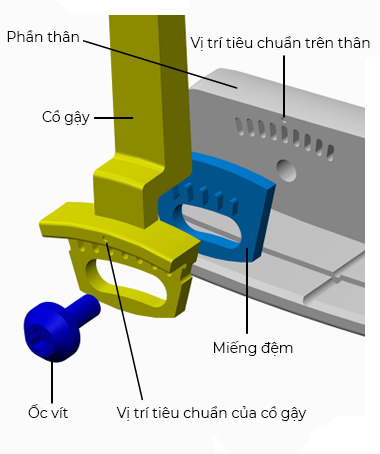 ② Với cổ gậy ở vị trí tiêu chuẩn, khớp “các lỗ trên cổ gậy” và “các nấc lồi ở miếng đệm phía cổ gậy” với các trị số.