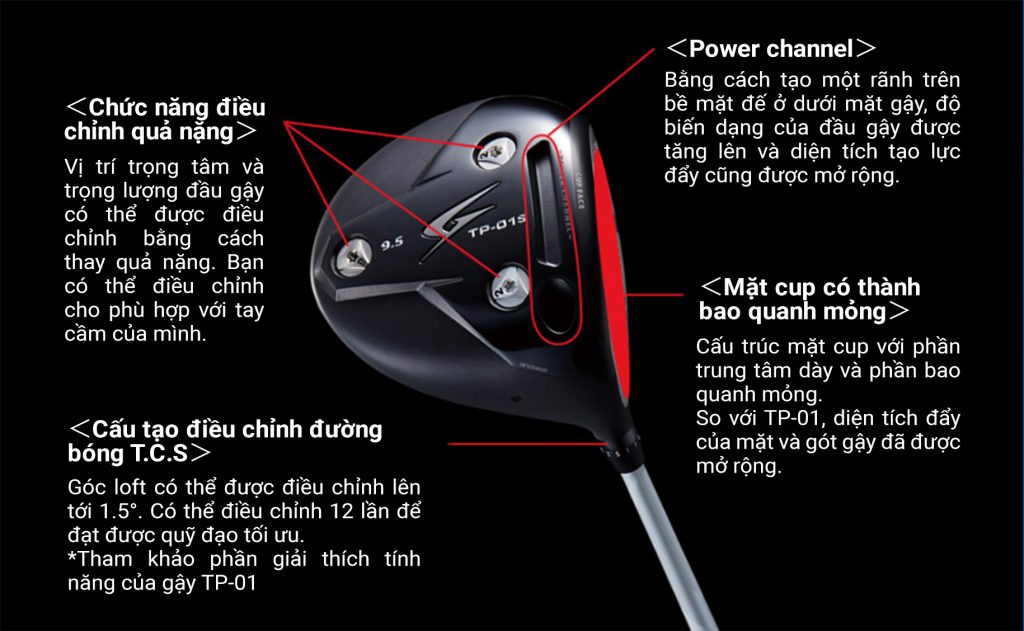 Bằng cách sử dụng mặt cup cho mọi cây gậy dòng Fairway wood/Utility, diện tích đẩy được mở rộng và hiệu quả đẩy được nâng cao. Gậy Fairway wood sử dụng mặt trên bằng cacbon để giảm trọng lượng, phần đầu gậy được làm lớn hơn và gắn thêm quả nặng để hạ thấp trọng tâm gậy. Momen quán tính cũng được khuếch đại, tạo ra một quỹ đạo bay mạnh mẽ có khả năng hạn chế sai sót và triệt tiêu độ xoáy. Với gậy Driver, chúng tôi sử dụng hình dạng mặt lưng với độ nông 460cm³, mang lại cảm giác an toàn cho cú đánh, hạn chế lỗi và cho phép bạn điều chỉnh góc loft, góc lie và góc của mặt gậy.